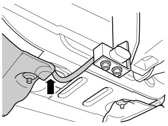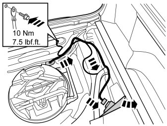 - Take the ground terminal from the kit and secure the ground lead to the ground terminal on the left-hand side at the rear member. Torque tighten the screw, tightening torque 10 Nm (7.5 lbf.ft.).