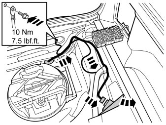 - Take the ground terminal from the kit and secure the ground lead to the ground terminal on the left-hand side at the rear member. Torque tighten the screw, tightening torque 10 Nm (7.5 lbf.ft.).