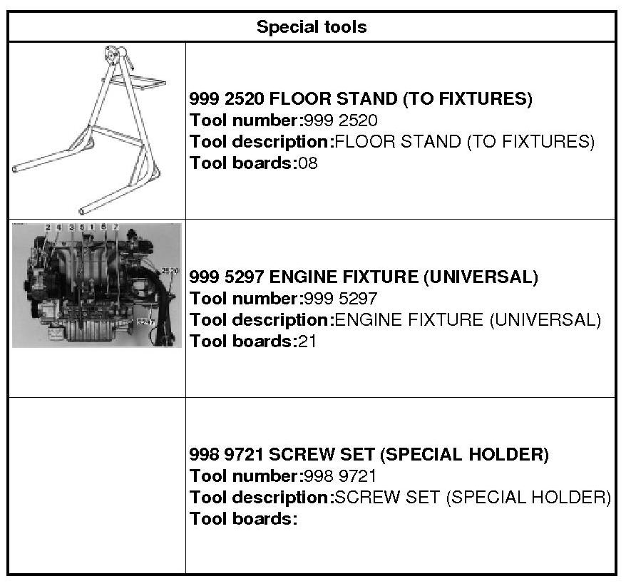 999 2520 FLOOR STAND 999 2520 Floor Stand 999 5297 ENGINE FIXTURE 999 5297 Engine Fixture 998 9721 SCREW SET 998 9721 Screw Set